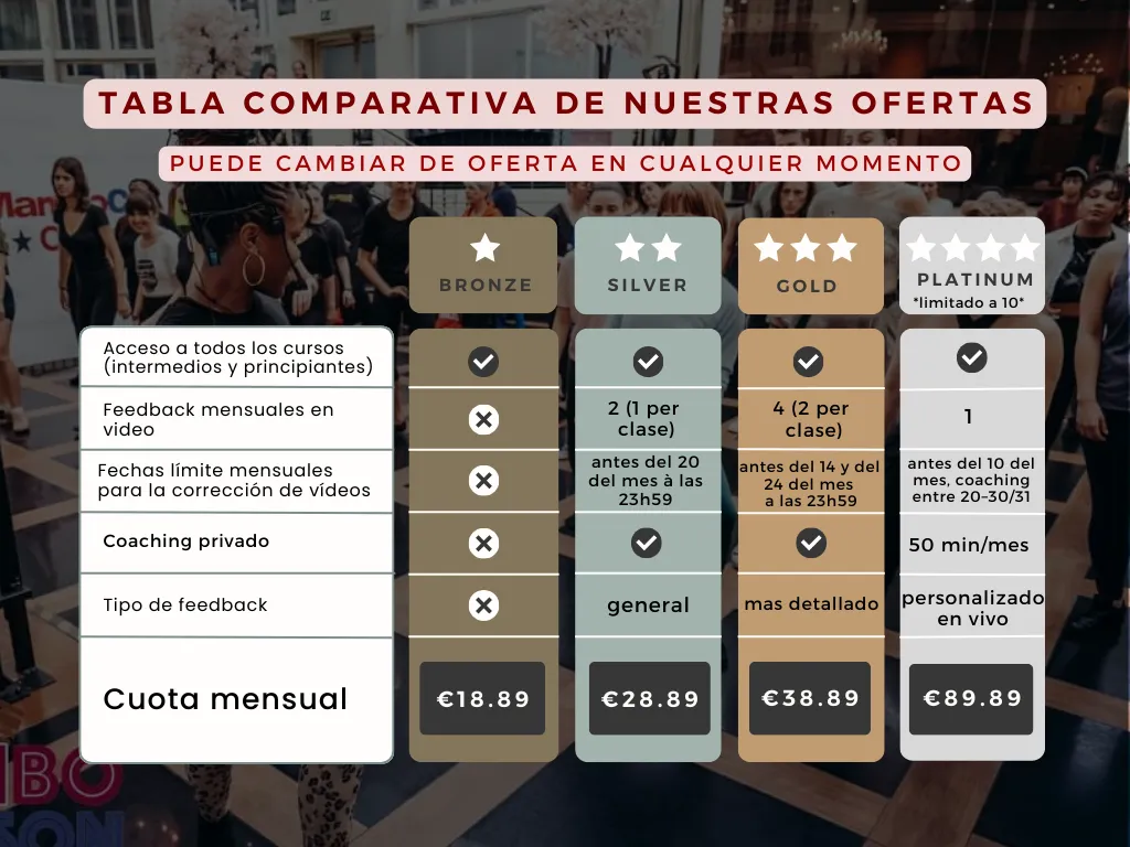 Le contrôle corporel, le contrôle du mouvement, les isolations, l’écoute musicale et les genres musicaux (cha-cha-cha, son, boogaloo, etc.) font partie des axes de travail et d’amélioration importants abordés dans ces cours.